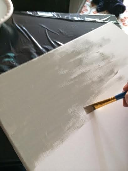 I wanted a lighter background- so that the letters were a little more dramatic. I also didn't want you normal straight paint job. So I got creative. I did one coat of the gray paint on the canvas.
